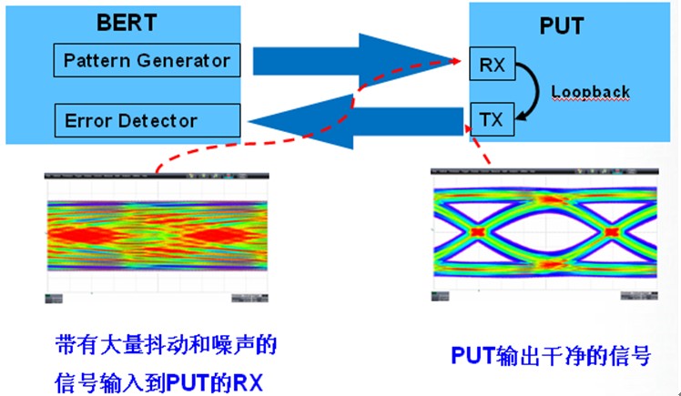 圖3為接收機(jī)測(cè)試的示意圖。接收機(jī)測(cè)試所需的儀器是誤碼率測(cè)試儀(簡(jiǎn)稱BERT),BERT通常包括碼型發(fā)生器(Pattern Generator)和誤碼檢測(cè)器(Error Detector)兩部分。在接收機(jī)測(cè)試時(shí),碼型發(fā)生器輸出特定碼型的、帶有大量抖動(dòng)和噪聲的信號(hào)到待測(cè)試產(chǎn)品(Product Under Test,簡(jiǎn)稱PUT)的RX,PUT接收到后通過(guò)時(shí)鐘與數(shù)據(jù)恢復(fù)電路(簡(jiǎn)稱CDR)、判別電路和解碼得到1和0組合的比特流,然后環(huán)回到輸出寄存器,從PUT的TX緩沖器發(fā)送出去,PUT的TX連接到了BERT的誤碼檢測(cè)器,誤碼檢測(cè)器中的CDR、判別電路處理后解碼得到1與0組合的數(shù)據(jù)比特流,然后與碼型發(fā)生器輸出的特定碼型數(shù)據(jù)對(duì)比,如果兩者完全吻合則沒(méi)有誤碼,否則,記錄下誤碼的數(shù)量和接收到的碼流的比特總數(shù),前者除以后者即誤碼率,同時(shí)記錄接收到誤碼時(shí)碼型發(fā)生器輸出信號(hào)的抖動(dòng)值。如果用示波器測(cè)量PUT的RX端接收到的信號(hào)的眼圖,通常是閉合的,如圖3的左下圖所示;如果用示波器測(cè)量PUT的TX端輸出信號(hào)的眼圖,通常是良好的眼圖,如圖3右下圖所示。修改碼型發(fā)生器輸出信號(hào)的隨機(jī)抖動(dòng)、固有抖動(dòng)、信號(hào)幅度等參數(shù),可以快速評(píng)估PUT的接收機(jī)性能。