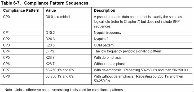 在USB3.0規(guī)范中定義了多種兼容性測(cè)試碼型(Compliance Pattern,簡(jiǎn)稱CP),如下圖4所示包括了CP0-CP8九種測(cè)試碼型。在TX測(cè)量中,需要用到CP0/CP1/CP7/CP8四種碼型:CP0用于眼圖與抖動(dòng)、共模電壓測(cè)量;CP1用于SSC展頻測(cè)量、隨機(jī)抖動(dòng)測(cè)量;CP7用于去加重測(cè)量;CP8用于差分電壓幅度測(cè)量。