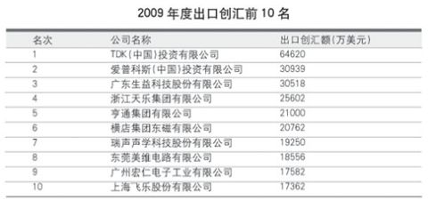 本屆元件百?gòu)?qiáng)企業(yè)中,97家企業(yè)有出口業(yè)務(wù),其中53家企業(yè)的出口下滑,有15家企業(yè)的出口下降程度在30%以上。出口總額超過1000萬(wàn)美元的企業(yè)達(dá)到68家,比上屆少1家;出口總額超過5000萬(wàn)美元的企業(yè)有25家,也比上屆少1家。但是,有16家企業(yè)2009年的出口額超過了1億美元,比上屆多1家。