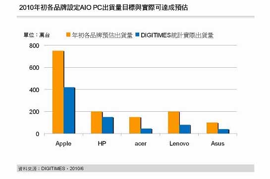 計算機一體機(AIO PC)(All In One PC,AIO PC)在2009年創(chuàng)下685萬臺、成長45.7%銷售成績后,DIGITIMES Research資深分析師兼主任簡佩萍預估,2010年 AIO PC 出貨量將進一步提高至1,115萬臺,成長62.8%,展現(xiàn)新興產(chǎn)品的強勁成長力道。