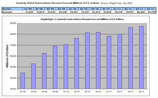 此次iSuppli預測2010全球半導體銷售額將增長35.1%,由2009的2296億美元提升達3103億美元。而該公司于5月時曾預測增長30.9%。