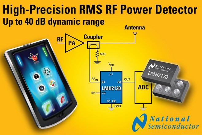 美國國家半導體的LMH2120線性均方根射頻檢波器可以準確測量射頻功率放大器(PA)的輸出,以便控制發射功率,避免干擾鄰近信號。LMH2120芯片可在攝氏-40度至85 度的全溫度范圍內穩定操作,在1900MHz輸入頻率下,在高達40dB 的寬動態范圍內,無論溫度如何變化,該芯片均可保持+/-0.5dB 的準確度,這令保護頻帶的范圍可以盡量縮小。該特性可擴大信號的覆蓋范圍并提高服務水平,如能在離蜂窩基站更遠的地方實現更高的上行鏈路數據速率。