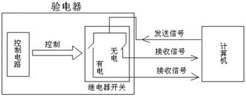 前文中信號是通過驗電器裝置發送到計算機,此時就遇到一個共地線問題,要讓計算機正確地識別驗電器傳送過來的信號就必須使計算機和驗電器共一個地線,否則,會因傳送線路過長不共地線而導致計算機識別信號出錯。本文改變信號傳送方式,如圖2所示,由計算機發送信號,驗電器內部通過繼電器開關來控制有電或無電線路的導通或斷開,計算機接收由自己發送的經過繼電器開關送來的兩路信號,若有電線路送來高電平信號,則無電線路送來低電平,此時高壓線有電;若無電線路送來高電平信號,則有電線路送來低電平,高壓線無電,若兩路線路都送來高電平信號或低電平信號則電路出錯。