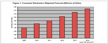 預(yù)計(jì)2011年消費(fèi)電子產(chǎn)品出貨量將達(dá)到16億個(gè),而2010年是15.6億個(gè)。消費(fèi)電子包括多種我們熟悉的產(chǎn)品,消費(fèi)者每天都會(huì)用到,如電視、立體聲和音頻部件、便攜媒體播放器、機(jī)頂盒、游戲機(jī)、DVD和藍(lán)光播放器、數(shù)碼相機(jī)、投影儀和攝像機(jī)、數(shù)字相框、電子書閱讀器和消費(fèi)電器。