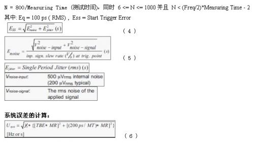 頻率和周期互為倒數,所以在頻率計的測試中,頻率和周期的誤差計算方法是一樣的。從測試誤差的產生來說主要有兩類,一類是隨機誤差,一類是系統誤差。隨機誤差主要由于如噪聲或者一些隨機因素產生的誤差,很難消除。系統誤差主要是由于測試方法、儀表設置或者儀表性能引起的誤差。不同的設備制造商都有自己的關于誤差的計算方法,大同小異,本文論述泰克FCA3000系列頻率計測試誤差的計算方法。