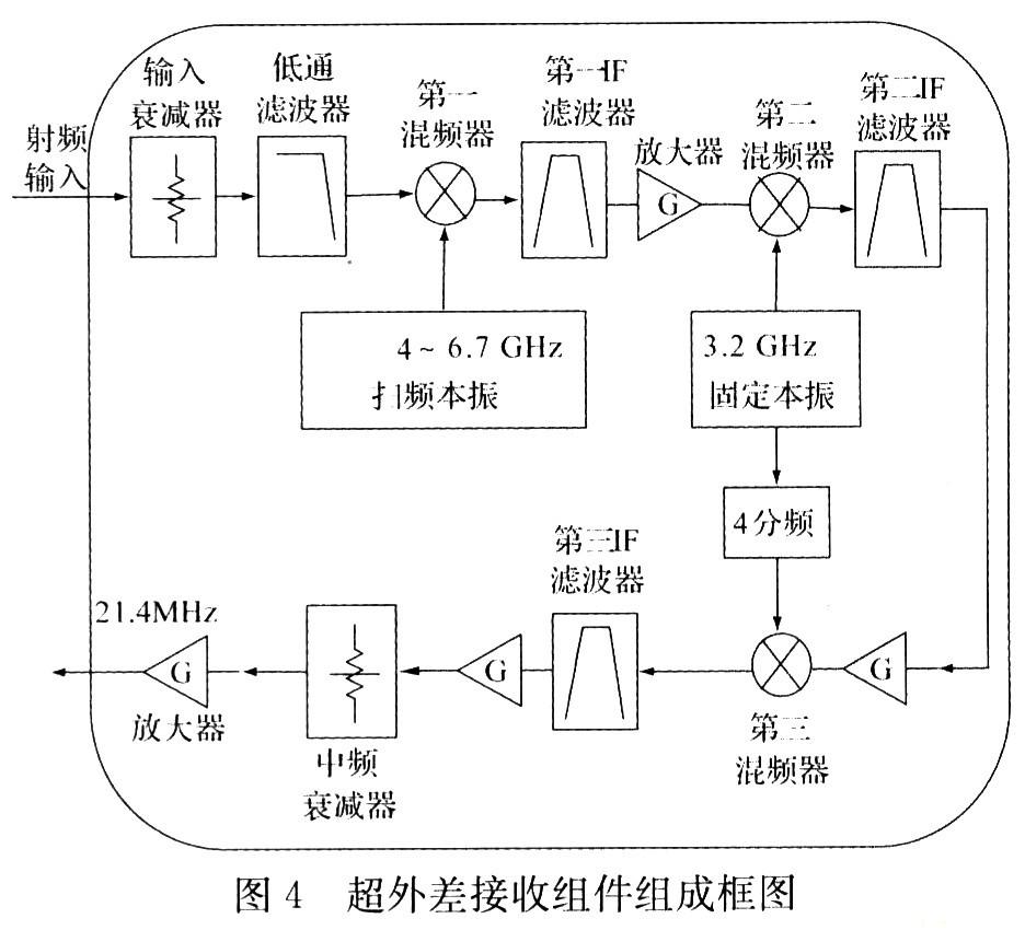 組件采用三級混頻方式實(shí)現(xiàn),第一中頻4 021.4 MHz,第二中頻821.4 MHz,第三中頻21.4MHz,這樣選擇的目的是第三混頻需要的800 MHz本振可以由第二混頻需要的3.2 GHz本振4分頻產(chǎn)生,從而減少了本振數(shù)量,降低了體積。