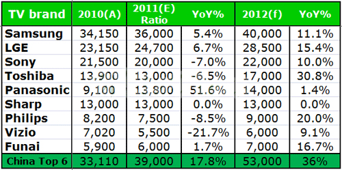 而今年Sharp以日本市場為主軸;Toshiba以日、歐為主要銷售地區(qū),年成長表現(xiàn)衰退;Sony銷售地區(qū)橫跨歐、美、日,除了區(qū)域性需求不振,加上其組織策略反映較緩慢,不僅財報未見起色,年度液晶電視出貨目標更呈現(xiàn)7%之衰退,下修至20百萬臺;Panasonic因購買Sanyo品牌,看似整體市占率提升,但內(nèi)部獲利壓力頗大,除打算出售位于日本茂原的六代廠,亦將減少8.5代廠的產(chǎn)能,后續(xù)仍須觀察;Philips以歐洲為主要市場,難幸免于歐債風(fēng)暴沖擊;Vizio面臨與LGD之合作關(guān)系生變,加上北美市場不景氣,年度銷售量下滑幅度甚鉅;反觀大陸品牌挾帶雄厚資源,年度銷售量成長依舊維持在17~18%左右,市占率更達19~20%,2012更預(yù)估有3成之成長力道。