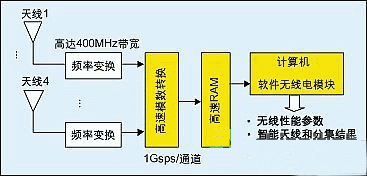 VIPER被設計成在最少的RF硬件條件下,在軟件中實現處理功能。圖4給出了接收器硬件的模塊示意圖。執行單階下變頻后,在四個信道的每一個信道的IF信號以每秒1G的采樣率被采樣。所采集樣本信號存儲在RAM中,并由計算機處理。