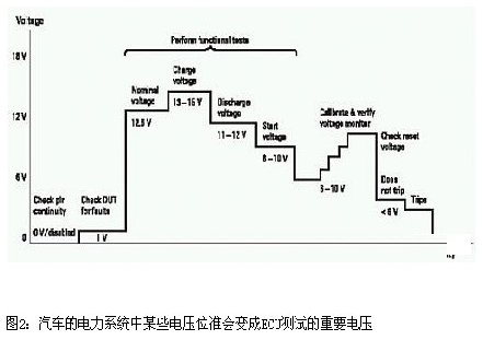 依汽車(chē)的操作狀態(tài)而定,在汽車(chē)的電力系統(tǒng)中常會(huì)碰到某些電壓位準(zhǔn)。這些位準(zhǔn)會(huì)變成ECU測(cè)試的重要電壓,如圖2所示。在這些重要電壓下執(zhí)行的一些相關(guān)測(cè)試包括: