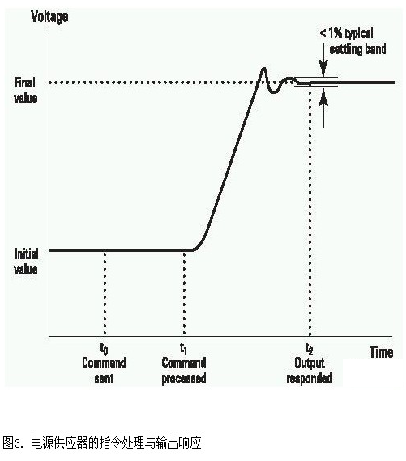 將電源供應(yīng)器的輸出電壓設(shè)定變更為新值時(shí),必須經(jīng)歷幾個(gè)步驟,如圖3 所示。這些步驟所花的時(shí)間很有限。當(dāng)電源供應(yīng)器接收到指令時(shí),必須加以處理,因此會(huì)有一段指令處理時(shí)間。接著,電源供應(yīng)器的輸出會(huì)予以回應(yīng)并變更成新的設(shè)定。它在某個(gè)穩(wěn)定區(qū)段內(nèi)達(dá)到終值所花的時(shí)間,即為輸出響應(yīng)時(shí)間。1%的穩(wěn)定區(qū)段對(duì)ECU 測(cè)試來(lái)說(shuō)是合適的。特別需要注意的是下調(diào)設(shè)定時(shí)的輸出響應(yīng)時(shí)間。許多電源供應(yīng)器都必須依賴(lài)真實(shí)的DUT 負(fù)載來(lái)降低電壓,在負(fù)載較小的情況下,一些不具下調(diào)設(shè)定器的電源供應(yīng)器可能需要花一秒左右的時(shí)間來(lái)達(dá)到終值。N6752A 電源供應(yīng)器模組內(nèi)建了一個(gè)下調(diào)設(shè)定器,能夠加快下調(diào)設(shè)定的速度,而不受負(fù)載的影響。在ECU 測(cè)試中,上調(diào)與下調(diào)設(shè)定都必須夠快才行。