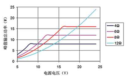 D 類放大器MOSFET輸出級的導通電阻會影響它的效率和峰值電流能力。降低負載的峰值電流可減少MOSFET的I2R損耗,進而提高效率。要降低峰值電流,應在保證輸出功率, D類放大器的電壓擺幅以及電源電壓的限制的條件下,選擇最大阻抗的揚聲器,如圖4所示。本例中,假設D類放大器的輸出電流為2A,電源電壓范圍為 5~24V。電源電壓大于等于8V時,4Ω的負載電流將達到2A,相應的最大連續(xù)輸出功率為8W。如果8W的輸出功率能滿足要求,則可以考慮使用一個 12Ω揚聲器和15V供電電壓,此時的峰值電流限制在1.25A,對應的最大連續(xù)輸出功率為9.4W。此外,12Ω負載的工作效率要比4Ω負載的高出 10%~15%。實際效率的提高根據(jù)不同D類放大器而異。雖然大多數(shù)揚聲器的阻抗都采用4Ω或8Ω,但也可采用其他阻抗的揚聲器實現(xiàn)更高效的散熱。