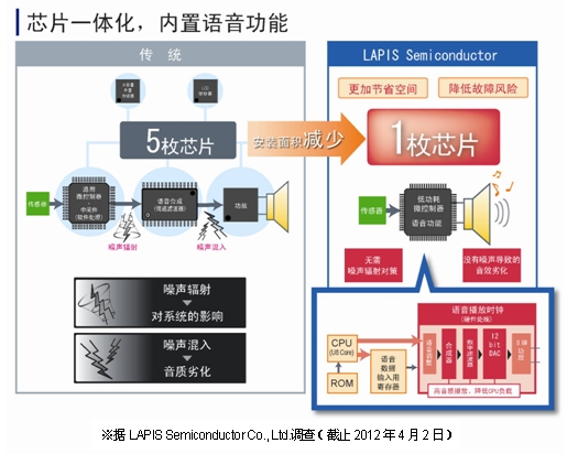 羅姆集團(tuán)旗下的LAPIS Semiconductor Co., Ltd.開發(fā)出一款單芯片的低功耗微控制器“ML610Q380系列”產(chǎn)品,此產(chǎn)品將以往用于家電的控制IGBT的PWM電路和LCD驅(qū)動(dòng)器等微控制器功能、以及高音質(zhì)、低功耗的語(yǔ)音播放功能集于一枚芯片,這在業(yè)內(nèi)尚屬首家。由于以往用于家電的微控制器沒有語(yǔ)音播放功能,因此想追加語(yǔ)音功能時(shí),語(yǔ)音合成功能和功放需要由不同的芯片組成。而使用本LSI產(chǎn)品,不僅可以芯片一體化,而且可以替換掉以往用于家電的微控制器,輕松實(shí)現(xiàn)語(yǔ)音功能,是需要語(yǔ)音輸出的家用電器和遙控器的最佳選擇。