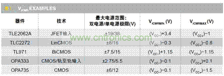 表1是德州儀器公司幾款運(yùn)放及其VICMR。最大電源區(qū)間欄中描述了雙電源和單電源的極限。表中可以明顯看到,不同運(yùn)放的輸入?yún)^(qū)間VICMR各不相同。根據(jù)器件的類型,VICMR可能進(jìn)入或超出電源軌。因此,永遠(yuǎn)不能假定某個(gè)運(yùn)放可以接受某個(gè)輸入信號(hào)區(qū)間,除非驗(yàn)證了數(shù)據(jù)表中的規(guī)格。