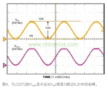 測(cè)試電路時(shí),在其輸入端加一個(gè)直流偏移為VCC電壓一半(或5V)的300Hz正弦波。調(diào) 節(jié)交流幅度,直到看到VOUT有一個(gè)變化。當(dāng)施加10V峰峰值輸入時(shí),VOUT顯示一個(gè)接近正電源軌的削峰信號(hào),而不是接近負(fù)電源軌。這個(gè)接近正電源軌的不良性能就是預(yù)計(jì)輸入超過(guò)9.2V時(shí)的結(jié)果。對(duì)于0~9.2V之間的VIN,VOUT顯示和預(yù)期一樣的正確波形(圖4)。