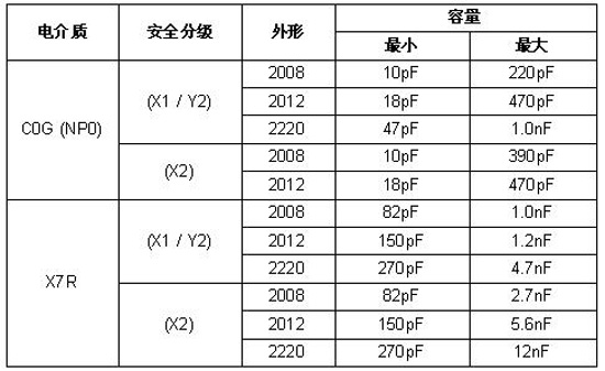 采用C0G(NP0)電介質的VJ Safety器件的容量低至10pF,-55℃~+125℃溫度范圍內的容量溫度系數(shù)(TCC)為0ppm/℃±30ppm/℃,每十年的最高老化率為0%。如果用戶需要更高的容量,采用X7R電介質的器件可提供12nF的容量,-55℃~+125℃溫度范圍內的TCC為±15%,在0VDC電壓下的每十年最高老化率為1%。電容器采用X1/Y2和X2安全分級,峰值脈沖電壓分別為5000V和2500V。