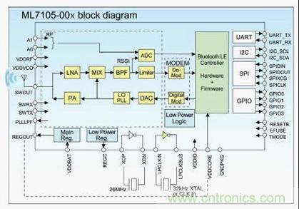 圖1:Bluetooth® LE LSI(ML7105-00x)的內(nèi)部結(jié)構(gòu)