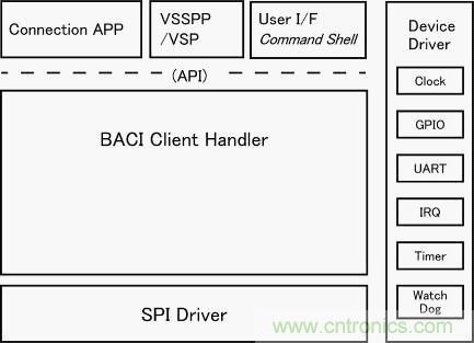 BACI通過簡化與主機之間的通信來降低訪問頻率。而且,在結(jié)構(gòu)設(shè)計上采用通過事件使主機啟動的結(jié)構(gòu),因此,是盡可能使主機停動來抑制耗電量的設(shè)計。綜上所述,本LSI在整個結(jié)構(gòu)模塊上進行了降低耗電量的設(shè)計,從而,使紐扣電池驅(qū)動3年以上連續(xù)工作成為可能。主機和堆棧結(jié)構(gòu)如圖2所示。