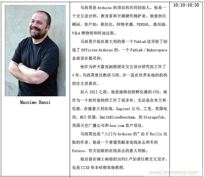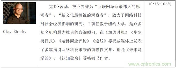 本次創(chuàng)客論壇三天共三個主題:啟蒙創(chuàng)新、創(chuàng)客本質(zhì)和協(xié)同合作,將邀請到包括暢銷書《失控》作者Kevin Kelly、克萊舍基、Arduino開源電子原型開發(fā)平臺聯(lián)合創(chuàng)始人Massimo Banzi、第一個生物創(chuàng)客空間BioCurious聯(lián)合創(chuàng)始人Tito Jankonski、F.laobo的制作人和ArduinoFio的設(shè)計者Shigeru Kobayashi、Intel最小的實習(xí)生Joey Hudy和為麻省理工研究生授課的14歲電子神童QuinEtnyre等等共50余位來自全世界各地的創(chuàng)新領(lǐng)域領(lǐng)軍人物。