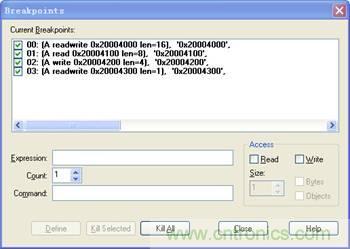 具體定義方法:在Expression內(nèi)輸入變量的地址,然后選擇讀寫屬性,并正確設(shè)置字節(jié)范圍,最后點(diǎn)擊Define即可。例如,在地址0x20004000開始,16字節(jié)范圍內(nèi),定義讀寫斷點(diǎn)操作,具體設(shè)置方法如圖4所示。