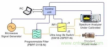 在圖1中,微波信號(hào)發(fā)生器所產(chǎn)生的信號(hào)經(jīng)過一個(gè)可編程的帶通濾波器到達(dá)一個(gè)SPDT微波開關(guān)的輸入端(RF1),開關(guān)的二個(gè)輸出端J1和J2分別接需要被校準(zhǔn)的頻譜分析儀和標(biāo)準(zhǔn)功率計(jì)。在校準(zhǔn)測(cè)試過程中,功率計(jì)讀一次來自信號(hào)源的幅度后,開關(guān)即刻切換到頻譜分析儀,并記錄頻譜分析儀針對(duì)信號(hào)源幅度的讀數(shù)。