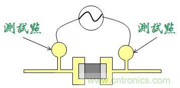 但是如果讓這些探針直接接觸到板子上面的電子零件或是其焊腳,很有可能會壓毀一些電子零件,反而適得其反,所以聰明的工程師就發明了「測試點」,在零件的兩端額外引出一對圓形的小點,上面沒有防焊(mask),可以讓測試用的探針接觸到這些小點,而不用直接接觸到那些被量測的電子零件。