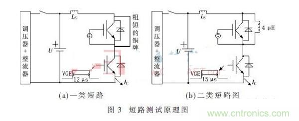 圖3(a)為一類短路測試原理圖,電網電壓經過調壓器和整流橋,將母線電容電壓充到1 500 V,上管igbt的門極被-15 V關斷,且用粗短的銅排將其短路。對下管的IGBT釋放一個12 μs的單脈沖,直通就形成一類短路。圖3(b)為二類短路測試原理圖,將母線電容電壓同樣充到1 500 V,上管IGBT的門極被-15 V關斷,且給上管并聯一個4 μH的電感作為負載,下橋臂通過IGBT驅動器釋放一個15 μs的單脈沖就形成二類短路。
