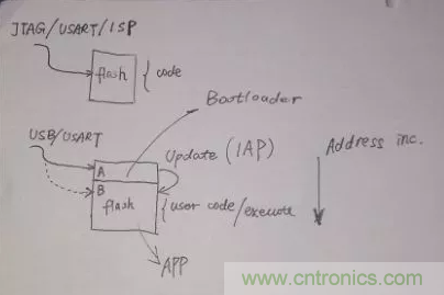 而在IAP編程中,flash被分區為A和B兩個區域,A區域只允許用USB/USART等方式下載,此區域作為更新B區域的代碼用。