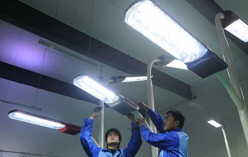 圖:天津工業大學海宇半導體照明產業化基地的員工在組裝LED照明燈