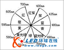 為對光的色學性質研究方便,將可見光譜圍成一個圓環,并分成九個區域(見圖),稱之為顏色環。