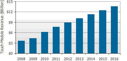 圖一 2008-2016全球觸控模塊產(chǎn)值及預(yù)測(單位:十億美元)