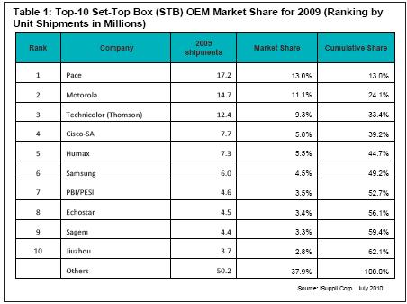 與此同時(shí),2009年市場(chǎng)份額數(shù)據(jù)顯示,隨著Pace公司完成對(duì)飛利浦STB業(yè)務(wù)的收購(gòu),正在成為新的市場(chǎng)份額王者。