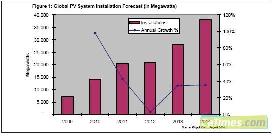 預計今年全球光伏裝機容量將增長到14.2GW,比2009年的7.2GW大增97.2%,而且也沒有明年降溫的跡象。圖1所示為2009-2014年全球光伏裝機容量預測,2014年新增光伏系統預計將達到38.1GW。