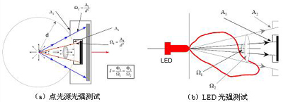 圖4中,點光源光強在空間各方向均勻分布,在不同距離處用不同接收孔徑的探測器接收得到的測試結果不會改變。但是,LED由于其光強分布不一致,使得測試結果隨測試距離和探測器孔徑而變化。因此,CIE-127提出了兩種推薦測試條件,使得各個LED在同一條件下進行光強測試與評價如圖5所示。目前,CIE-127推薦測試條件已經被各LED制造商和檢測機構引用。