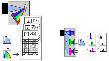 現有的顏色特性測試方法有分光光度法和積分法。分光光度法是通過單色儀分光測得LED光譜功率分布,然后利用色度加權函數積分獲得對應色度參數;積分法是利用特定濾色片配合光電探測器直接測得色度參數(見圖7)。分光光度法的準確性要大大高于積分法。