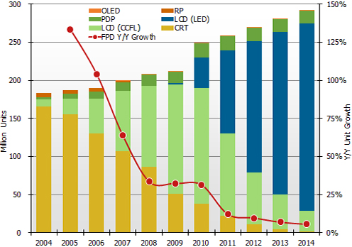 - 預計總體液晶電視出貨量將穩步增長,到2014年達到2.7億臺