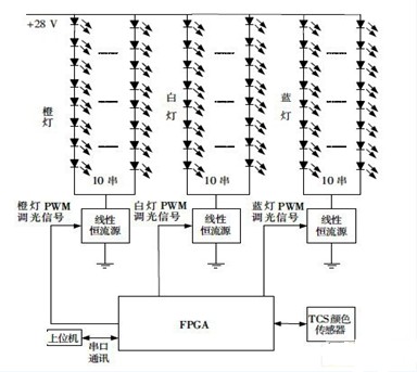 以FPGA作為控制器,根據(jù)上位機的調(diào)光指令調(diào)整PWM 占空比,從而控制背光亮度;采樣顏色傳感器的數(shù)據(jù),微調(diào)橙燈和藍(lán)燈的PWM 占空比,保證在溫度發(fā)生變化時色溫不變。