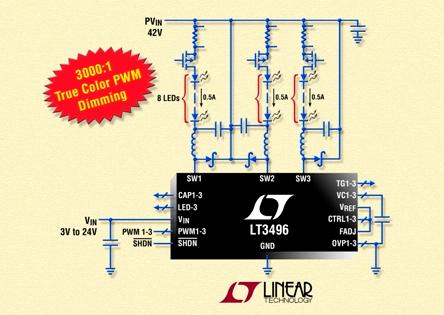 LT3496:凌力爾特推出2MHz DC/DC轉換器用作3通道恒流LED驅動器