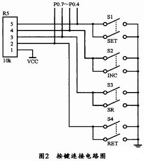 獨立式鍵盤通常用在按鍵較少的系統中,每個按鍵單獨占有一根I/O口線,各鍵的工作狀態相互獨立,互不影響。由于本文的顯示面板的調節按鍵只有4個,因此,設計使用獨立式按鍵接法。其鍵盤接口電路如圖2所示。