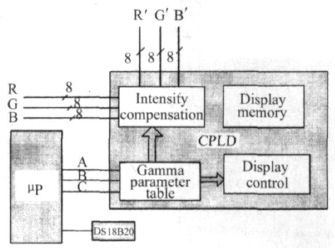 為了補償LED 因溫度引起的亮度變化,LED 顯示系統增加了亮度檢測電路。實驗發現,以20 ℃溫度間隔對色彩進行溫度補償時,能基本上滿足圖像的觀看質量。為此,系統以常溫為基礎,每隔20 ℃給出相應基色的Gamma 校正參數。對于- 20 ℃~ + 80 ℃范圍,每個基色給出供5 種不同的Gamma 參數以補償亮度的變化。圖6 給出系統的溫度檢測電路和相應的控制Gamma 參數的電路框圖。利用溫度傳感器DS18B20檢測環境溫度的變化,當環境溫度到達設定溫度值時,通過微處理器的ARC 3 個I/ O 線輸出5 個溫度狀態中的某一狀態值給CPLD。在CPLD 內部設有RGB 三基色(3 ×4 + 1 = 13)13 個(常溫時采用一個標準的Gamma 參數校正,在其他溫度下,每個基色一個校正參數) Gamma 值的參數表,從表查出分別對應RGB 的3 個Gamma 值提供給亮度控制電路和顯示控制電路。