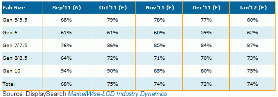 在前幾個(gè)月里,TFT-LCD面板廠一直控制生產(chǎn)以減少庫存并降低損失。但根據(jù)DisplaySearch MarketWise-LCD Industry Dynamics報(bào)告指出,10月稼動(dòng)率從9月的68%上升到了75%。
