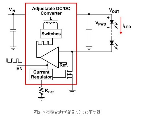 某些具有電流汲入的驅動器將輸入PWM訊號濾波,然后以經過位準偏移的訊號來驅動電流汲入,如TPS6116x系列之類的其他驅動器則使用輸入PWM訊號,將負載周期用于能隙參考電壓,因此VREF=D×VREF(MAX)。由于ILED DC電流變化緩慢,因此輸出電容電壓不會有漣波。所以電容不會出現像采用PWM調光時所產生的振動。