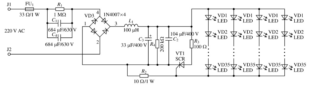該電路共驅動140只白光LED (小功率) ,采用35串4并的模式,采用電容降壓式驅動方式。其中, C1、C4 為并聯(lián)的兩個相同的電容,起降壓及限流作用; 4個1N4007組成的整流橋對輸入交流電壓進行整流;濾波電容C3 用于濾除整流輸出電壓中的交流成分,使電壓更為平滑; L1、C2 用于濾除輸出電壓中的高頻成分;電阻R4 為C3 提供放電回路;采用單向晶閘管SCR729210對電路進行保護, R3 為限流電阻。