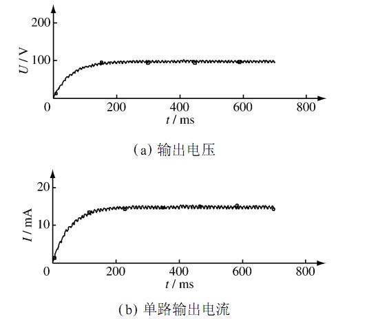 為理論上驗證設計的可行性,采用PSp ice軟件對電路進行了仿真分析。結果如圖2所示。電路在210 ms時進入穩(wěn)定狀態(tài),穩(wěn)定后其輸出電壓為97 ±2. 2 V,輸出電流為14. 7 ±0. 3 mA,基本驗證了電路設計的可行性。LED 日光燈電路輸出特性如圖2所示。