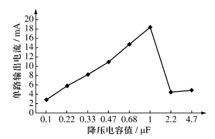 在不損壞LED的條件下進行了測試,降壓電容C1 的電容值與輸出電流的關系如圖4所示(因為兩個電容是相同的,圖4中只表示出單一電容值)。可見,隨著電容值的增加,輸出電流幾乎呈線性上升,待增加到一定值時(約20 mA) ,保護電路起作用,迫使經(jīng)過LED支路的電流下降。