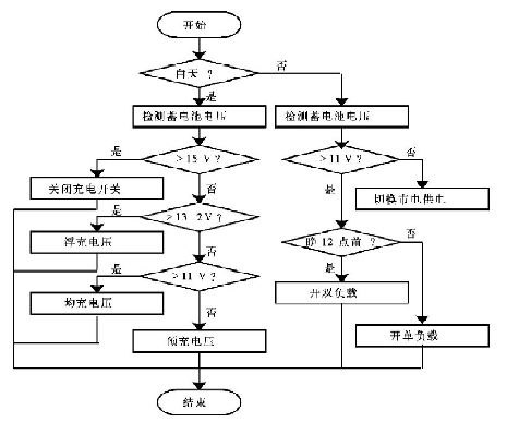 在放電過程中,首先保證在晚上12點前開通兩路負載,12點后開通一路負載,并且當蓄電池電壓低于保護電壓(11V)時,控制器自動切換到市電供電系統(tǒng)或關(guān)閉負載開關(guān)以保護蓄電池不受損壞。因此,充電管理和放電管理是系統(tǒng)軟件設(shè)計中的主要內(nèi)容,充放電程序流程圖如圖4 所示: