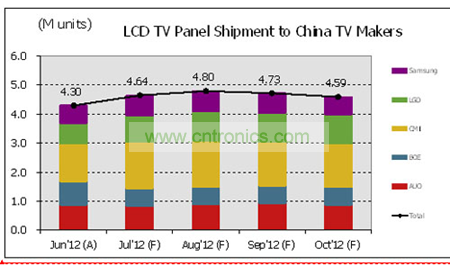 圖一、Jun’12 – Oct’12出貨至中國本土廠商電視面板數量趨勢分析