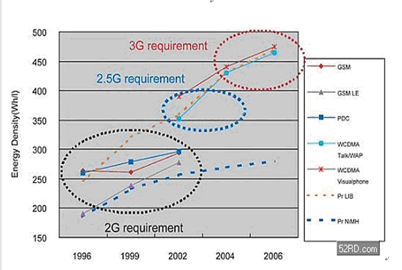 (圖二) 3G行動(dòng)電話對(duì)電池能量密度的規(guī)格需求