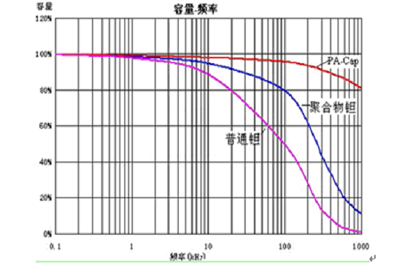 圖2.  PA-Cap、聚合物鉭電容、普通鉭電容的容量隨頻率變化