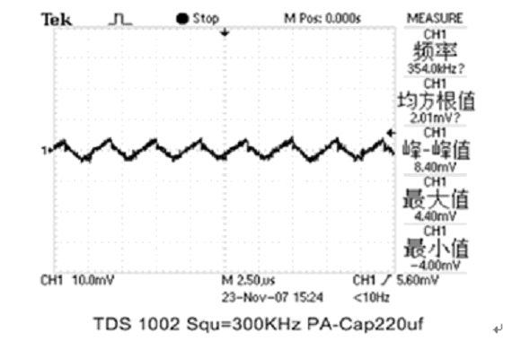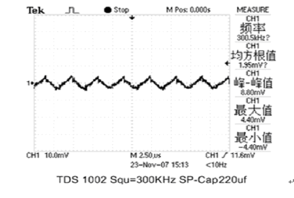 現分別用1只2V/220μF PA-Cap或2V/220μF松下公司聚合物固體疊層鋁電解電容器(SP-Cap)接在輸出電容Cout位置,測試其濾波效果。輸出波形如圖4和圖5所示: