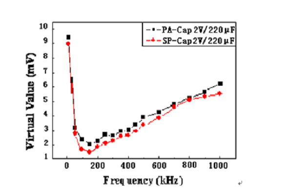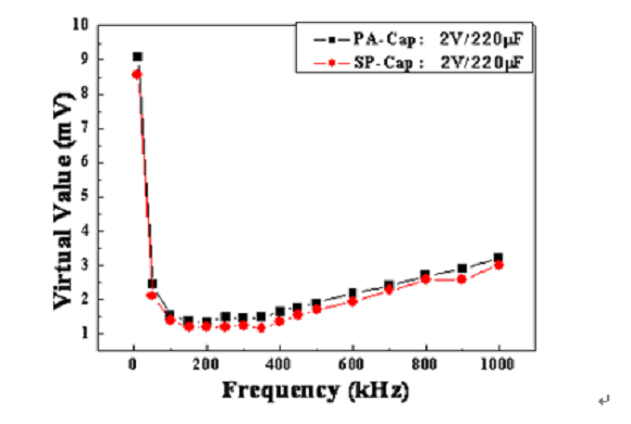 如上面的濾波效果顯示,當開關電源頻率在300KHz左右時,同種規格的PA-Cap的輸出均方根與SP-Cap的很接近,所以PA-Cap濾波效果基本接近于SP-Cap。由于具有低的ESR、允許的紋波電流大,所以PA-Cap也是DC/DC轉換器或開關電源輸出電容的優選電容之一。
